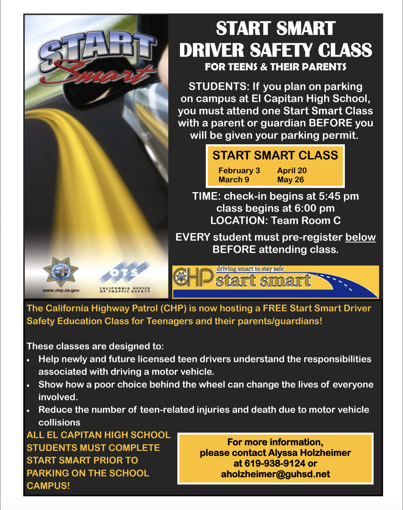 If you plan on driving to school and parking at El Capitan, you must attend one Start Smart Class with a parent or guardian BEFORE you will be given your parking permit.